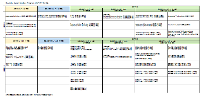 | 選択科目/9単位 | ※科目群A JLPTN1 A【1単位】 JLPTN2 A【1単位】 関西方言A【1単位】 ※科目群B みんなで学ぶ国際ビジネス事情【2単位】 ※科目群C 日本の現代社会A【2単位】 国際経済と日本企業A【2単位】 |